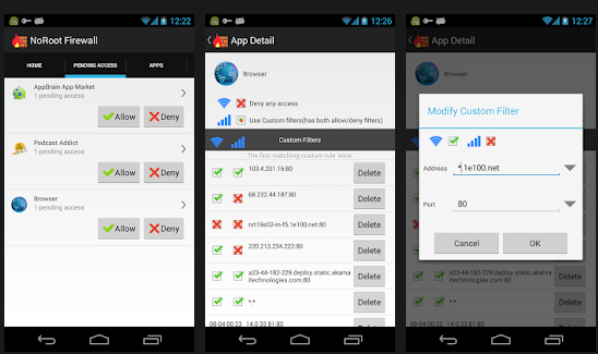 NO ROOT 요구와 방화벽 응용 프로그램. 응용 프로그램이 인터넷에 액세스하려고 할 때 그것은 알려줍니다. 각 연결은 / 선택적으로 차단 허용 할 수 있습니다.