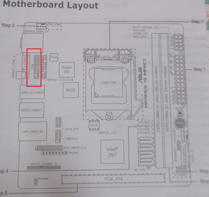 우선 본인의 메인보드에서 사진의 빨간 원과 같은 TPM 슬롯이 있는지 본인의 메인보드를 꼽꼽히 확인해보세요