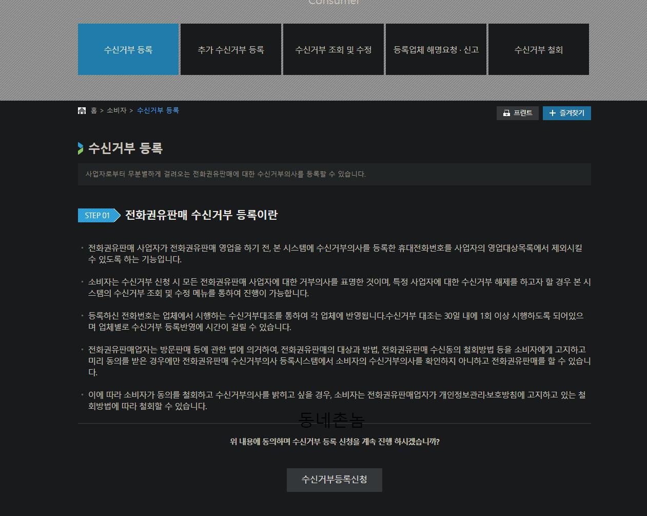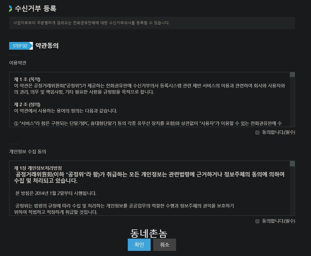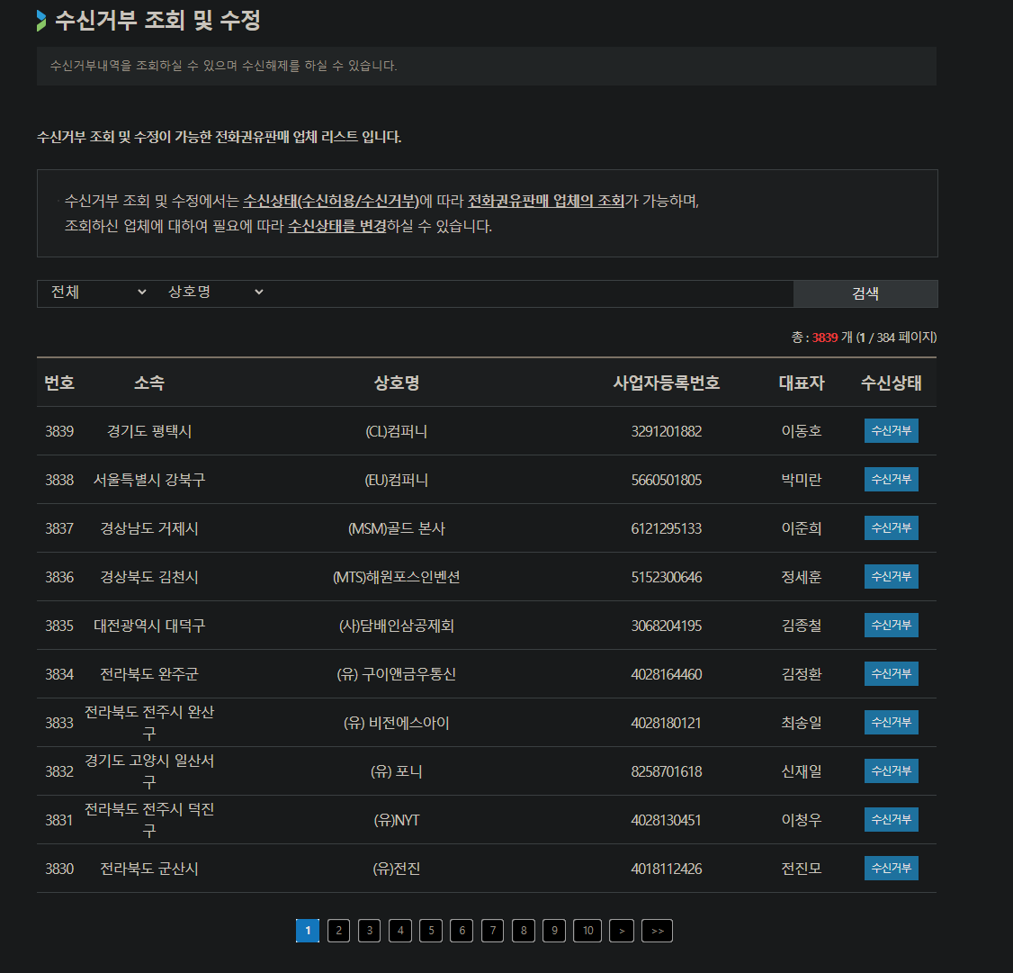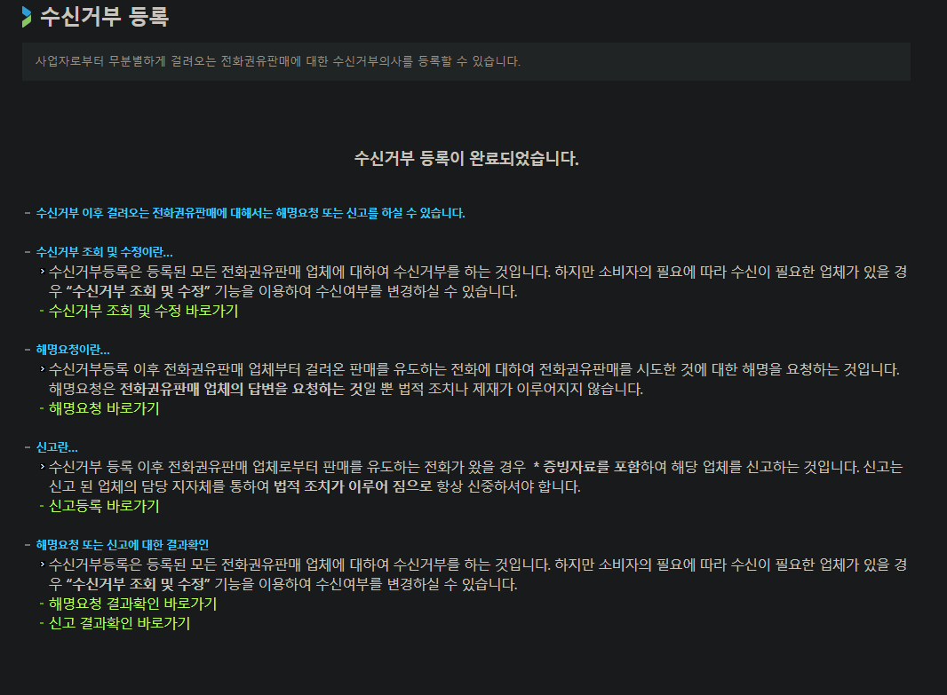 - 소비자는 수신거부 신청 시 모든 전화권유판매 사업자에 대한 거부의사를 표명한 것이며, 특정 사업자에 대한 수신거부 해제를 하고자 할 경우 본 시스템의 수신거부 조회 및 수정 메뉴를 통하여 진행이 가능합니다.